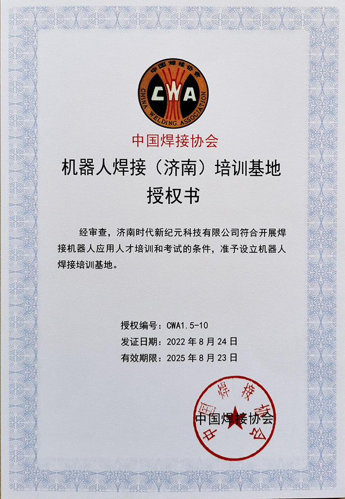 2022年8月24日上午,中國焊接協(xié)會機器人焊接(濟南)培訓(xùn)基地授權(quán)續(xù)約儀式在濟南時代新紀元科技有限公司舉行。中國焊接協(xié)會副會長兼秘書長李連勝、副秘書長吳九澎、教育與培訓(xùn)工作委員會專家委主任戴建樹、教育與培訓(xùn)工作委員會副秘書長李波、教育與培訓(xùn)工作委員會副秘書長李月華等行業(yè)領(lǐng)導(dǎo)參加培訓(xùn)基地續(xù)約儀式。參加活動的時代公司領(lǐng)導(dǎo)包括:北京時代科技股份有限公司總經(jīng)理羅錦、機器人集成事業(yè)部總經(jīng)理付玉儉、焊接工藝實驗室主任張自祥等。