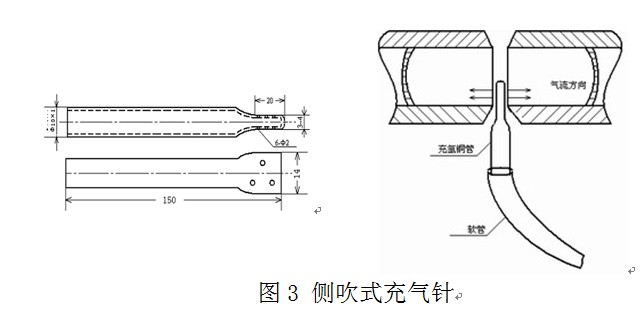 采用圖1 所示的充氬裝置,但將充氣針設(shè)計成圖3所示,即將原充氣針端部焊接密封,而在兩個側(cè)面分別鉆3個φ2mm的小孔,讓氬氣從兩個側(cè)面向氣室送氣。同時對焊接工藝進行調(diào)整:打底焊接時保留充氣針部位不焊,隨即進行蓋面層焊接,最后取出充氣針,焊接層次封口。