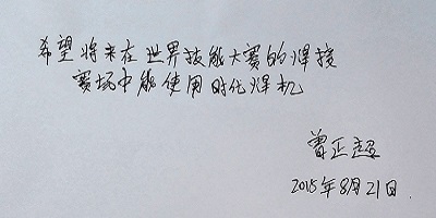 從第41屆世界技能大賽開始,焊接項目的培訓(xùn)和選拔賽一直使用北京時代的電焊機?!皶r代焊機,中國品牌”,“時代焊機,國賽用機”,歷屆大賽選手對時代焊機非常熟悉,對時代產(chǎn)品具有特殊的感情。在第43屆世界技能大賽巴西比賽現(xiàn)場,舉辦方選用的是美國林肯焊機。曾正超和周樹春教練結(jié)合比賽期間的現(xiàn)場感受,和時代團隊溝通了時代焊機和國外品牌產(chǎn)品的性能對比和差異,對代表中國品牌的時代焊機的發(fā)展提出期望,世界冠軍曾正超親筆題寫:“希望將來在世界技能大賽的焊接賽場中能使用時代焊機”。