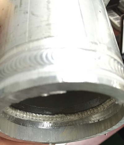 第二模塊鋁合金構(gòu)建中鋁管的焊接難點主要在于背部融透(如圖6)和內(nèi)在質(zhì)量的保證。背部融透主要是考驗選手對熔池的理解,在組對焊縫0間隙的情況下,如何能夠識別熔池溫度是否達(dá)到,送遞焊絲時間的選擇,這些都至關(guān)重要,而且在焊接過程中,由于鋁合金的導(dǎo)熱系數(shù)大,焊接過程中隨著溫度的上升,焊接速度也會越來越快,如果手法跟不上,只是依靠小電流慢速焊,這樣就會在某一點(比如引弧處)不停的加熱,局部時間加熱久了焊縫內(nèi)部會很容易出現(xiàn)過熱裂紋,焊縫表面發(fā)白無光澤,所以鋁合金焊接一般要求大電流快速焊接,也是為了在引弧初期就能夠快速打開鋁合金表面的Al2O3薄膜。該薄膜熔點高達(dá)2050℃,極大地超出了鋁的熔點(660℃),由于這層薄膜的保護(hù),所以鋁不易產(chǎn)生腐蝕,但在焊接時,Al2O3會阻礙熔池金屬良好結(jié)合,容易形成夾渣氣孔等缺陷,可以說是焊接的障礙,所以在鋁合金焊接中要想達(dá)到探傷一級確實很難。一般要先進(jìn)行酸堿水清洗或機(jī)械清理等前期處理。還要保證干燥不潮濕的情況下焊接才能夠保證質(zhì)量,當(dāng)然對于選手的焊接操作技能也是首選。這次參賽的65名選手中,該項射線探傷滿分40分的情況下只有一人滿分,30分以上的有7人,內(nèi)在質(zhì)量不得分的占多數(shù)。這與鋁合金焊接普及面較窄也有關(guān)系。隨著這項賽事的不斷進(jìn)展。我想在不久將來大家一定會攻克難關(guān),充分掌握好這門技術(shù)。