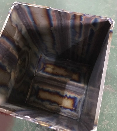對于第三模塊中不銹鋼結(jié)構(gòu)件的焊接,個人觀點是其焊接難點要更甚于鋁合金的焊接。眾所周知不銹鋼在高溫狀態(tài)下非常容易氧化,而且變形量也較大。這次的不銹鋼結(jié)構(gòu)件組對完畢后,所有焊縫根據(jù)要求都不允許留間隙、開坡口焊接,并在背部充氣的情況下實現(xiàn)單面焊雙面成型(如圖7),它的焊接難點之一首先是為防止變形,如何選擇好組對之后的焊接順序,其次是焊接過程中如何能夠保證一次焊接背部成型和表面焊縫成型不氧化,乍聽起來好像這兩點有些矛盾,首先要想保證在不留間隙的情況向背面焊透,就要使熔池的溫度充分達(dá)到,而熔池溫度一旦過高焊縫表面就很容易氧化發(fā)黑,本屆比賽各路選手也是各顯其能,對于氬弧焊噴嘴的使用從6號嘴到10號甚至更大都有使用。其實從理論上來講,要想使氬弧焊接不銹鋼表面成型好,顏色好,主要就是氣體的保護(hù)效果,如果比賽允許使用氬氣保護(hù)拖罩進(jìn)行三重保護(hù),即熱影響區(qū)也保護(hù)起來,那么焊縫達(dá)到銀白色的金屬光澤也是有可能的,但這次只允許兩重保護(hù)(即內(nèi)充氣和氬弧槍本身氣體),那么對于焊縫的正表面只能采取大口徑噴嘴進(jìn)行,才能擴(kuò)大保護(hù)范圍,如果條件允許,也可以采用噴嘴內(nèi)裝有濾網(wǎng)的大口徑噴嘴進(jìn)行焊接,這樣的氣體保護(hù)會更均勻。但前提是采用大噴嘴口徑的焊槍對焊接過程中選手對熔池觀察的視線會有所影響,也要逐漸適應(yīng)。這次大賽對于大噴嘴的使用只有少數(shù)單位想到了這一點。隨著本次大賽的結(jié)束,我想以后對于不銹鋼焊接的氧化問題,會有更多的單位熟悉、掌握,甚至想出更好的辦法來解決不銹鋼焊接氧化的問題。